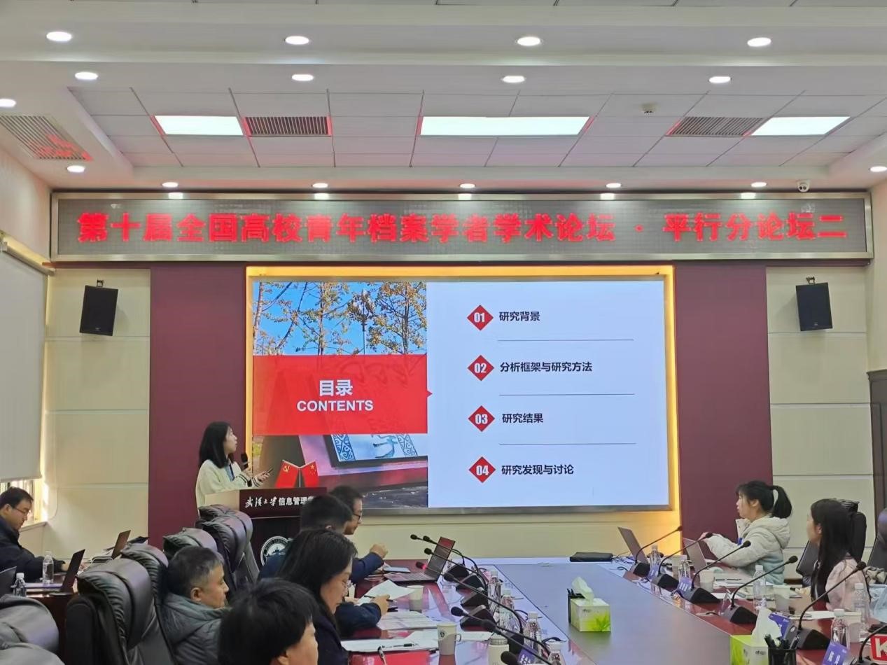 赵跃担任分论坛主持人,李琪汇报了其与赵跃合作完成的论文《档案数据的价值与应用场景:一项系统文献综述》,从多维度透视了档案数据的价值表象,明晰了国内外档案数据价值认知及其行动的差异、存在的问题与发展的趋势;王月在论坛上汇报了其与杨千合作完成的论文《数字政府建设中的组织数据文化:结构模型、作用机理与培育路径》,结合文化动态理论与组织数据实践,建构了组织数据文化四层次动态模型,并解析了其具体构成要素与相互作用。
