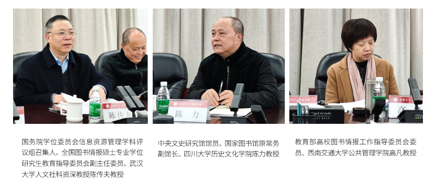 12月14日上午,十大买球的正规网站图书情报专业硕士学位授权点自评估专家评审会在萃文楼311室召开。本次评审会邀请了国务院学位委员会信息资源管理学科评议组召集人、全国图书情报硕士专业学位研究生教育指导委员会副主任委员、武汉大学人文社科资深教授陈传夫教授,中央文史研究馆馆员、国家图书馆原常务副馆长、十大买球的正规网站历史文化学院陈力教授,教育部高校图书情报工作指导委员会委员、西南交通大学十大买球的正规网站高凡教授,四川省普通高等学校图书情报工作指导委员会秘书长、十大买球的正规网站图书馆姜晓研究馆员,成都图书馆(成都市古籍保护中心)肖平馆长、中国科学院成都文献情报中心鄢小燕处长,四川省图书馆付玉贞副馆长等多位学界、业界专家担任评审。十大买球的正规网站班子成员、教师代表等参会。