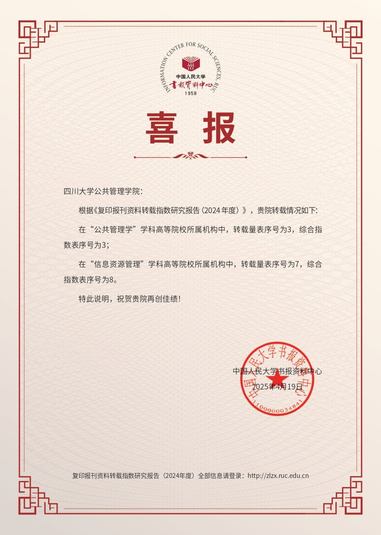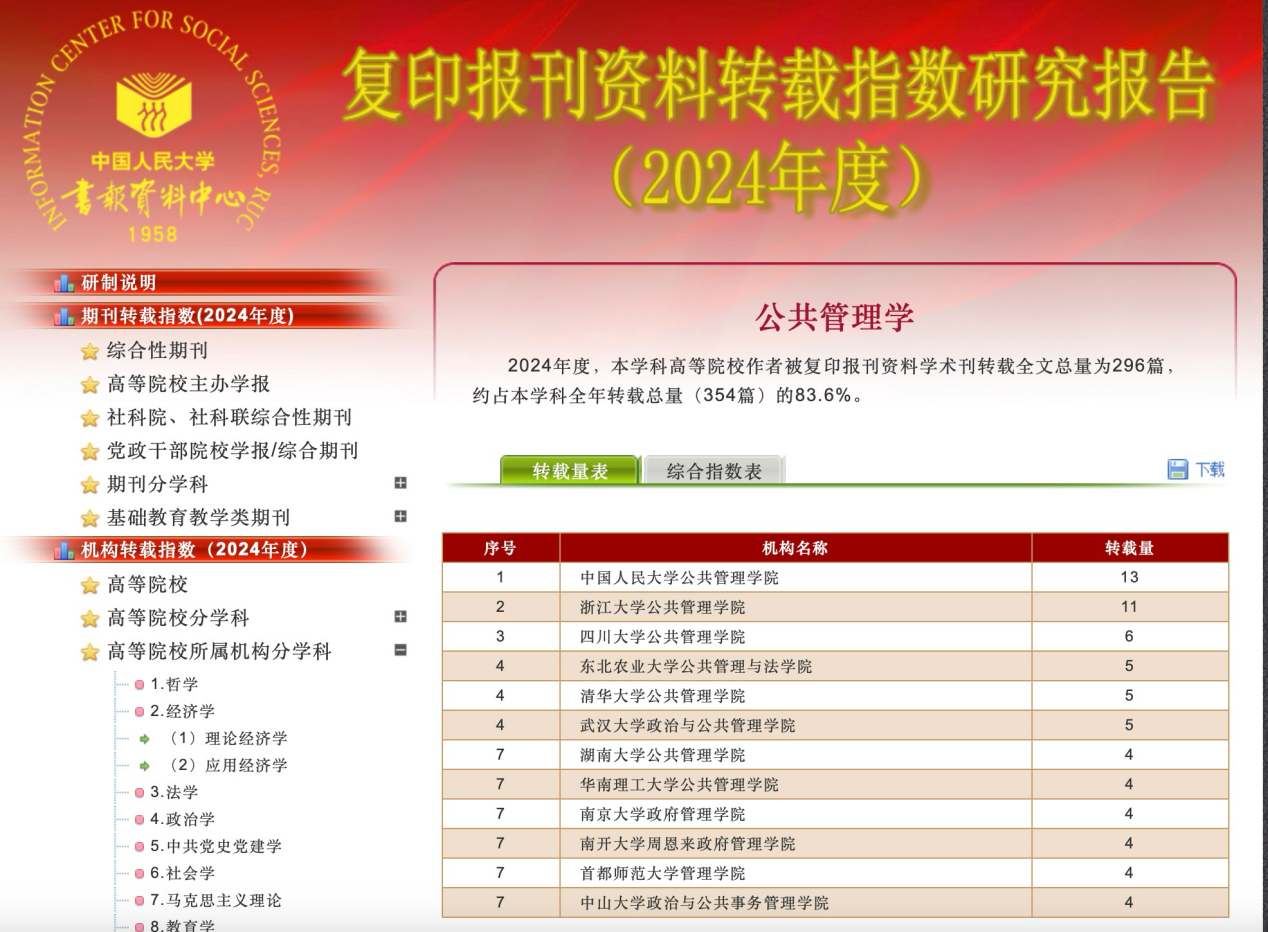 近日,中国人民大学书报资料中心发布了《复印报刊资料转载指数研究报告(2024年度)》。在“公共管理学”学科高校所属机构排名中,十大买球的正规网站转载量位列全国第3,综合指数位列第3;在“信息资源管理”学科高校所属机构排名中,十大买球的正规网站转载量位列全国第7,综合指数位列第8。本次入选展现了学院在公共管理学、信息资源管理两大领域的强劲学术影响力与持续创新能力。