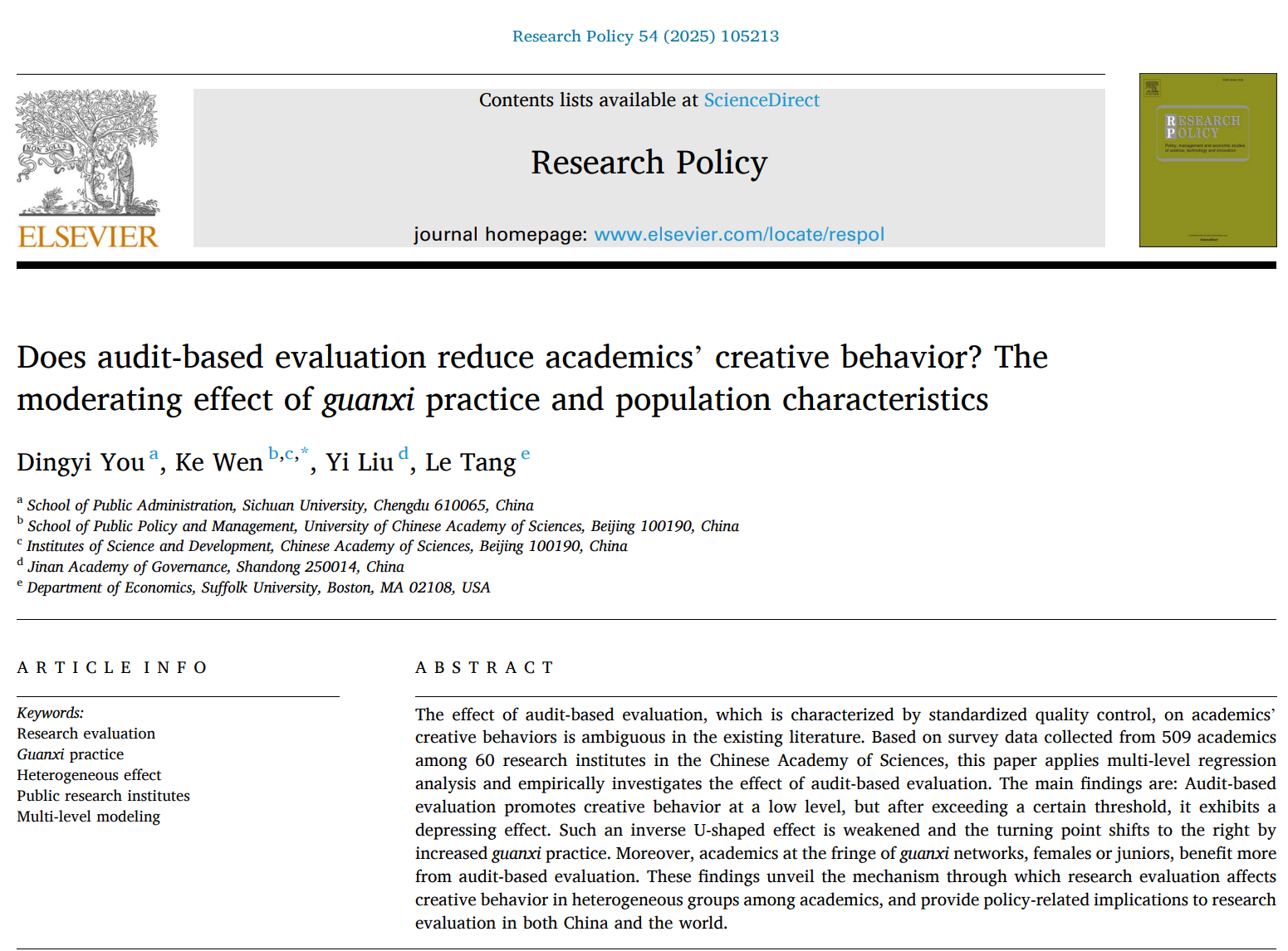 近日,十大买球官网行政管理系游玎怡特聘副研究员作为第一作者,在科技管理领域国际顶级学术期刊《Research Policy》发表题为《Does audit-based evaluation reduce academics' creative behavior? The moderating effect of guanxi practice and population characteristics》的研究论文。《Research Policy》主要刊发科研政策、技术创新、环境等多学科方面的研究论文,致力于分析和理解经济、政策、管理、环境等方面的问题,以其跨学科研究特色和高学术影响力著称,在创新研究领域具有标杆地位。这是十大买球官网首次在该期刊发表研究成果。