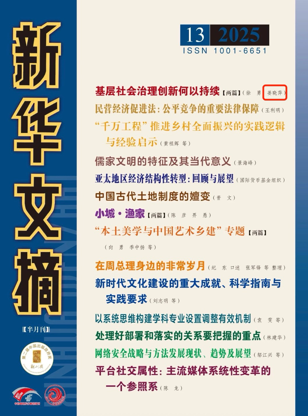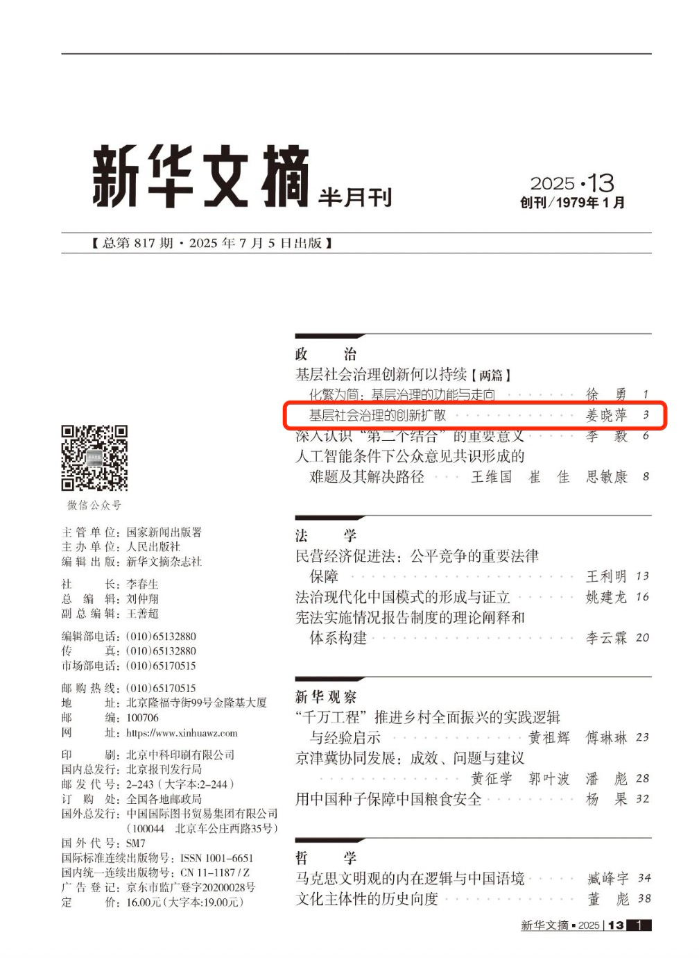 7月出版的《新华文摘》(2025年第13期)转载了十大买球官网姜晓萍教授的论文《基层社会治理的创新扩散》。