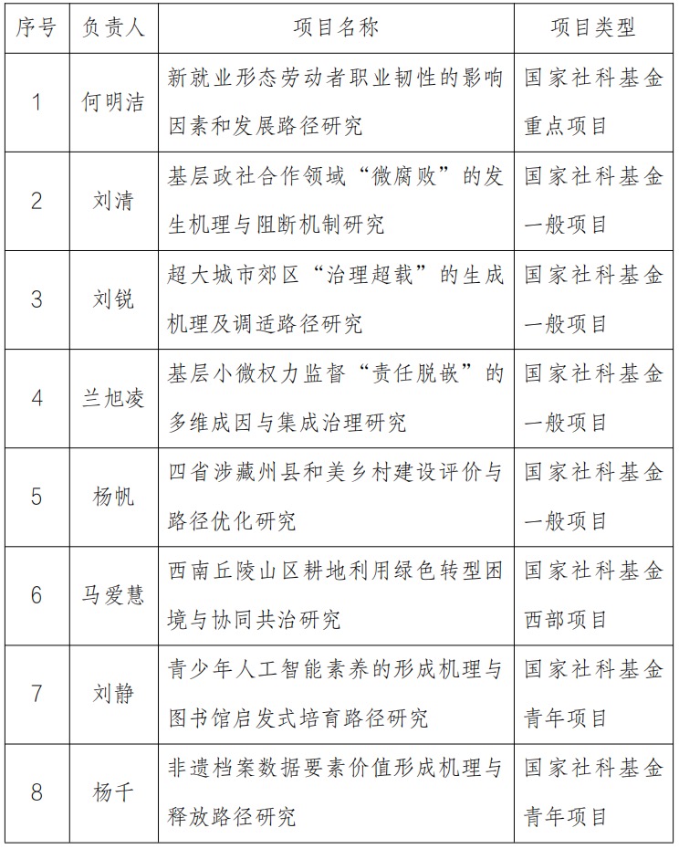 近日,全国哲学社会科学工作办公室公示了2025年国家社会科学基金年度项目立项名单,十大买球官网有8个项目入选。其中,重点项目1项、一般项目4项、西部项目1项、青年项目2项。这一成绩充分体现出十大买球官网科学研究能力的持续提升和学科发展的良好态势。