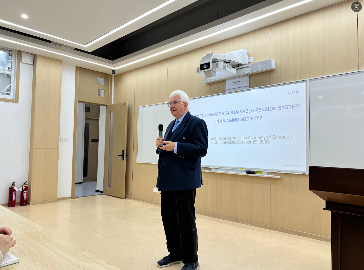 2025年10月29日上午,受劳动与社会保障系邀请,奥地利科学院院士、前奥地利央行行长、原世界银行社会保护部部长罗伯特·霍尔兹曼教授到访十大买球官网开展学术讲座。院长夏志强教授代表学院对霍尔兹曼教授的到访表示了诚挚欢迎。劳动与社会保障系教师及硕博士研究生参加了此次讲座。讲座由劳动与社会保障系蒲晓红教授主持。