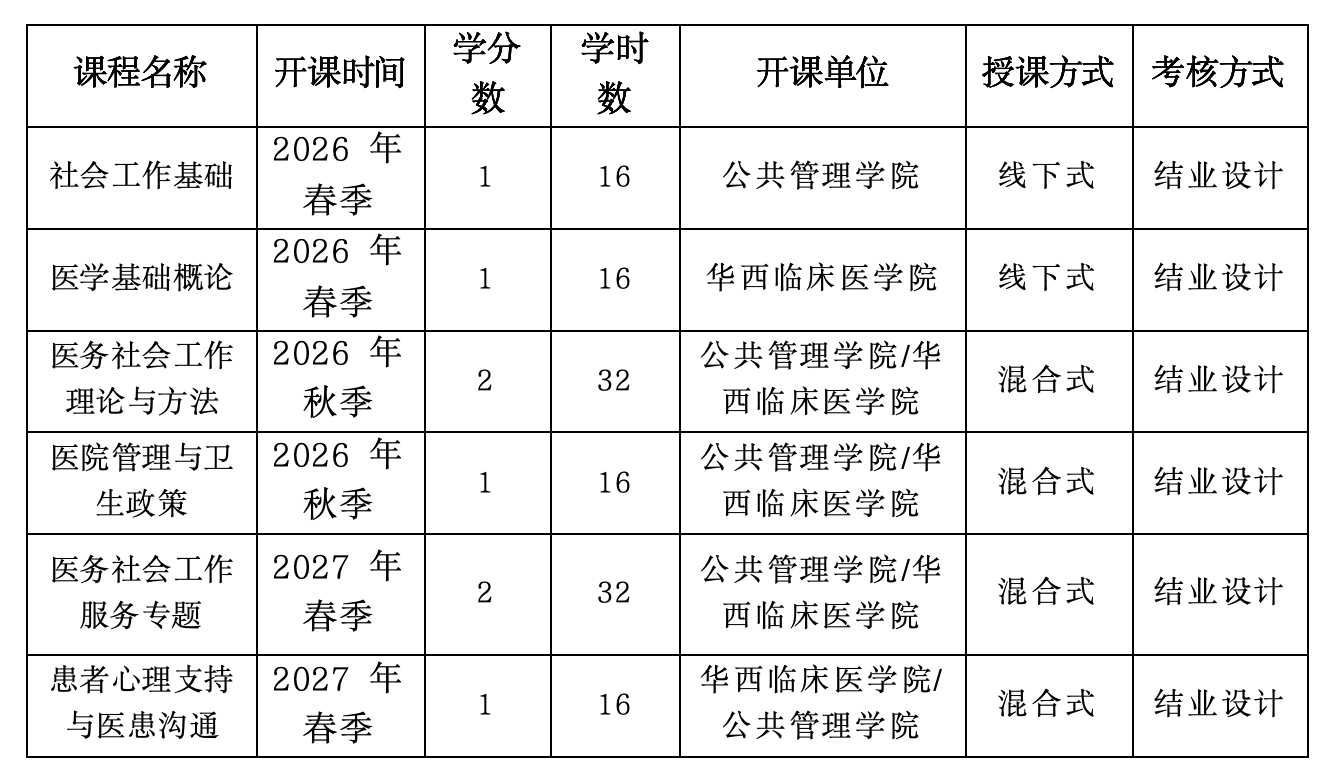 采用“课程学习+定向实训”培养模式,依托十大买球的正规网站社会工作专业与华西医院多部门(科室)师资,提供6门“线上+线下”课程,计8个学分,涵盖社会工作基础、医学基础、医务社工专题三个板块内容。