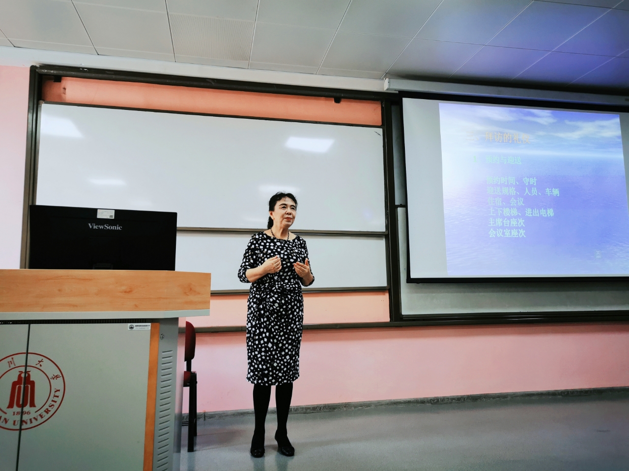 对于见面礼仪、交谈礼仪与拜访礼仪,侯苹老师以问答的形式展开讲述,通过与同学们的互动问答,引发同学们对于礼仪的思考,并最终引出正确的礼仪规范。