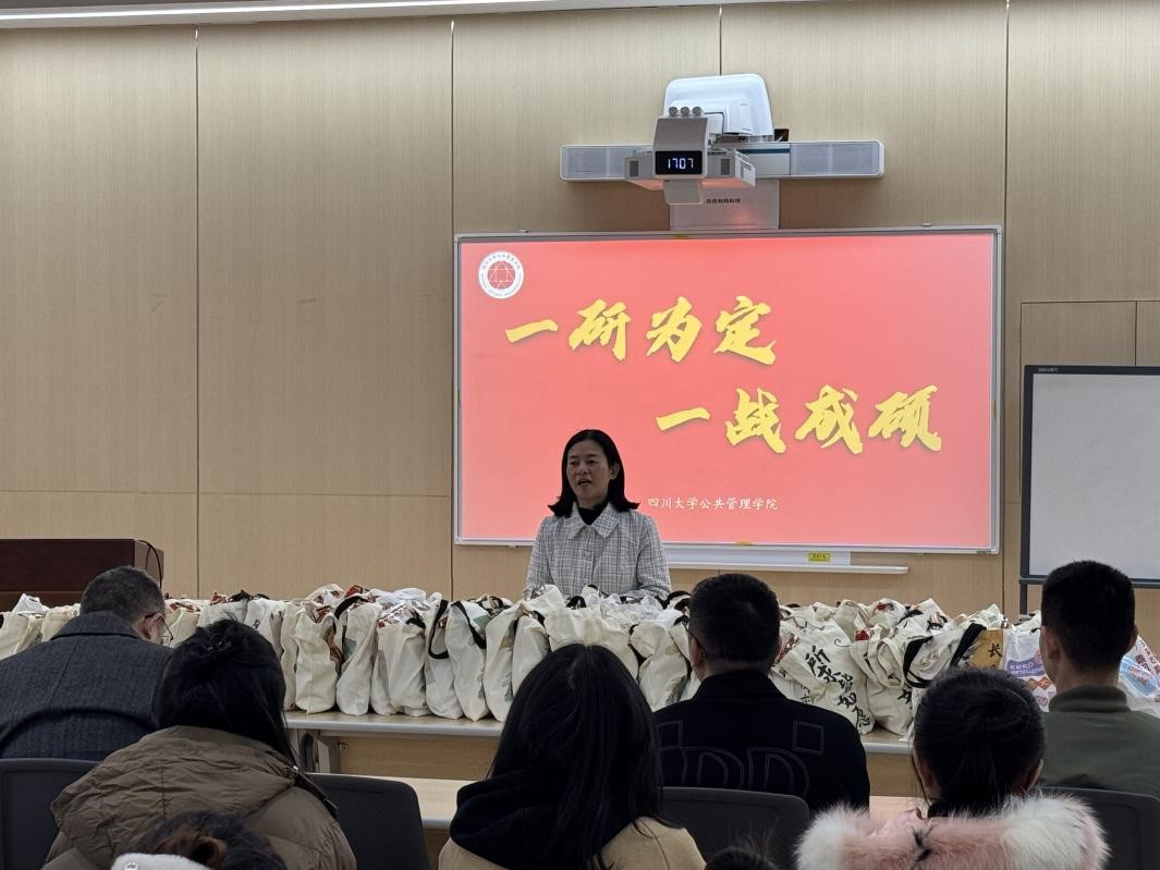 2025年全国硕士研究生招生考试在即,为帮助十大买球官网考研学子缓解备考压力、坚定备考信心,学院于12月5日下午在萃文楼205教室开展了“一‘研’为定、一战成硕”的“考研送温暖”活动。本次活动由学院党委副书记兼纪委书记罗亚玲主持,学院院长夏志强、副院长王慧敏、团委书记刘碧、秘书档案学系赵跃老师、社会学与心理学系徐文健老师、2024级研究生辅导员苟欢老师、2021级本科生辅导员付亚南老师以及学院2025届考研学子参加。
