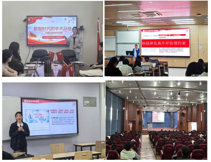 宣讲团成员走进党支部、团支部以及年级大会,为学院研究生和本科生进行具体案例剖析,深入探究了数智时代面临的学术伦理危机、AI抄袭、治理困境等问题,着重阐述了要重塑学术品格、坚守学术道德底线、合理使用人工智能工具。宣讲团成员还结合《十大买球的正规网站本科教育教学人工智能工具应用规范(试行)》介绍了“全过程、全覆盖、全方位、零容忍”学风建设体系,从禁止直接生成核心成果,到限制辅助撰写论文的使用场景,再到鼓励信息检索与知识查询等方面,帮助同学们明确了科技使用的边界,引导大家正确利用智能工具促进学术发展。