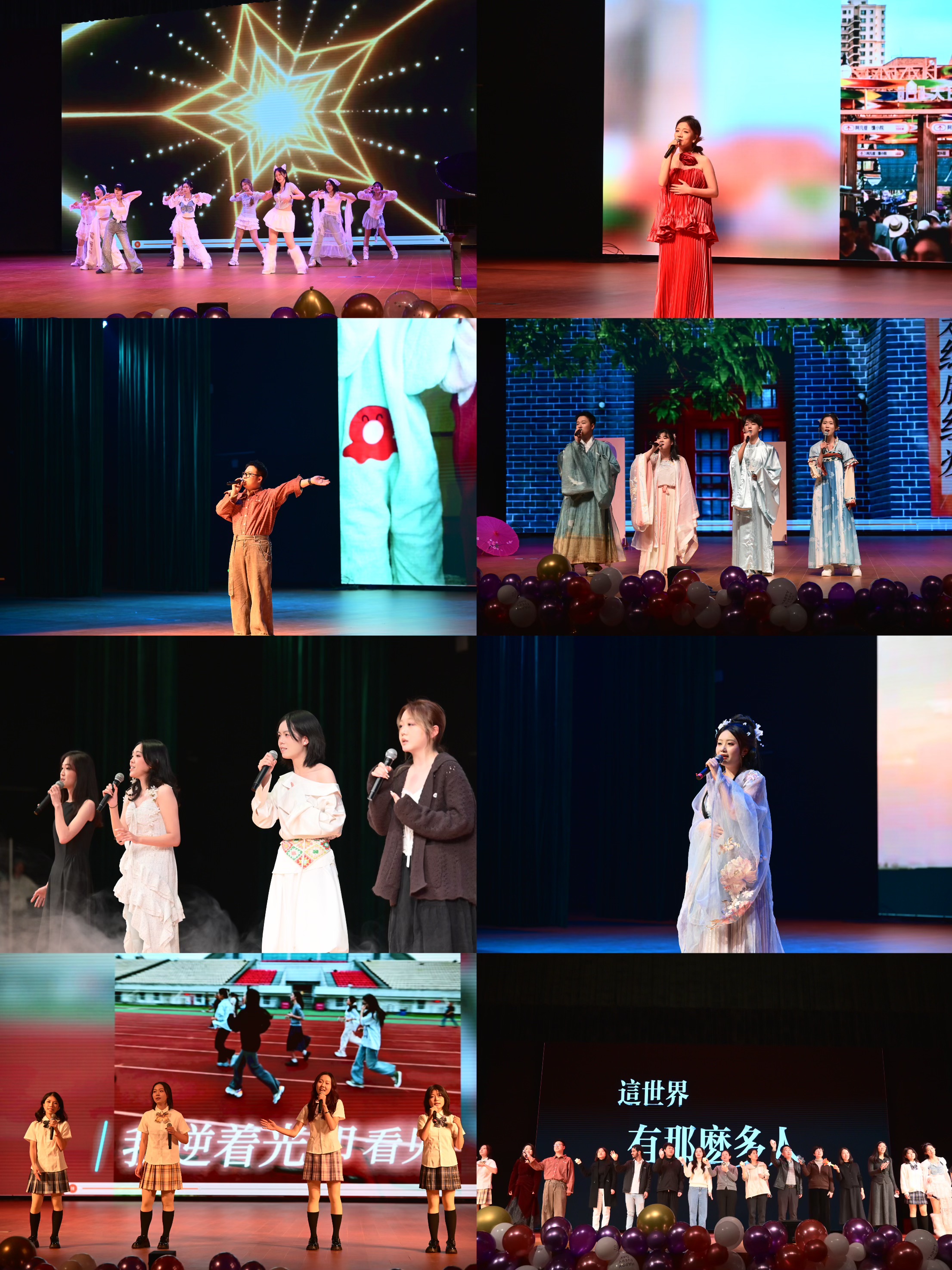 此次歌会主要有“青春回响·悸动时光”“岁月情长·温暖相守”“逐梦启航·逆光而上”三个篇章,以热场舞蹈《星光闪耀的青年》为序章、以合唱曲目《这世界那么多人》为终章。表演中穿插有“幸运掉落”“好运空降”“幸运收官”三轮互动环节,邀请中奖师生上台进行游戏互动。活动现场灯光与歌声交织,氛围十分热烈。