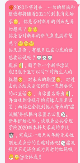 本次活动中,每位同学都能收获到两个匿名笔友,一位为自己带来温暖的新年祝福,一位为自己排忧解难。在信件顺利完成漂流后,同学们意犹未尽,通过不同的方式对本活动进行了欢愉的讨论,在积极寻找自己“漂友”的同时,也表达出对漂流信件的满心好奇和期待。
