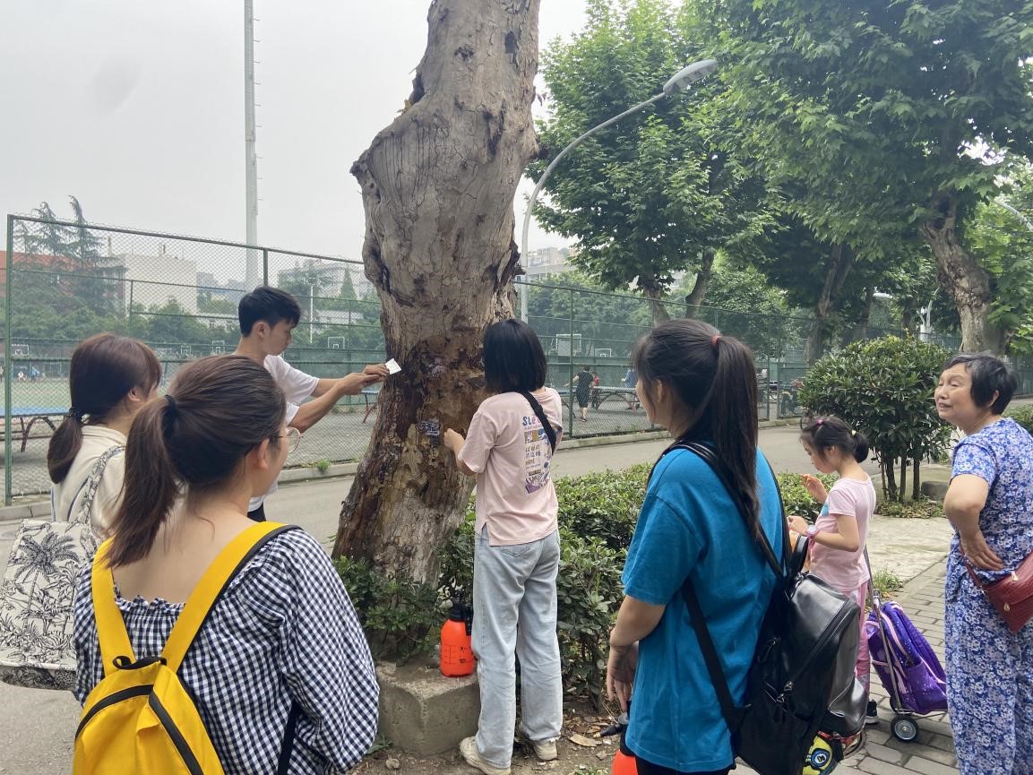 图为志愿者们在清理大树上的“牛皮癣”