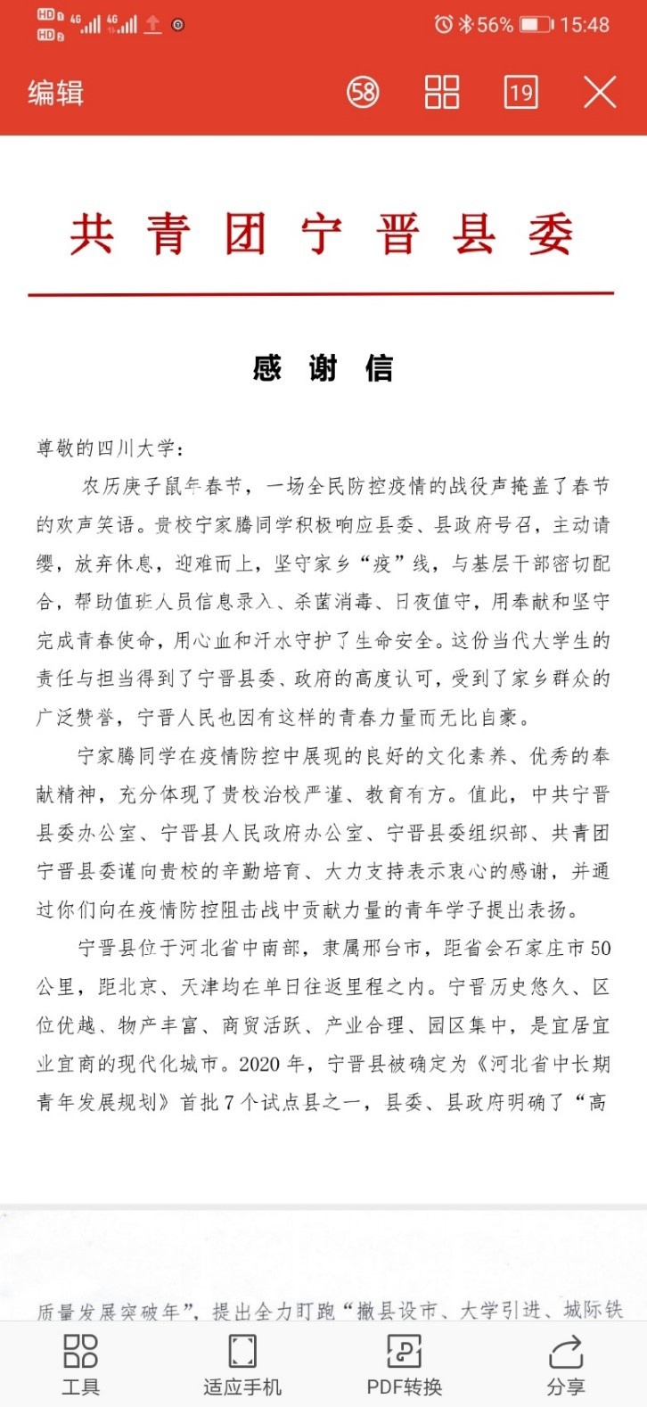 近日,十大买球官网收到了来自河北省宁晋县的一封感谢信。信中表达了对十大买球官网研究生宁家腾同学积极响应政府号召,主动参与家乡疫情防控工作的高度赞扬,同时表达了对我校及十大买球官网培养工作的充分认可与真挚谢意。