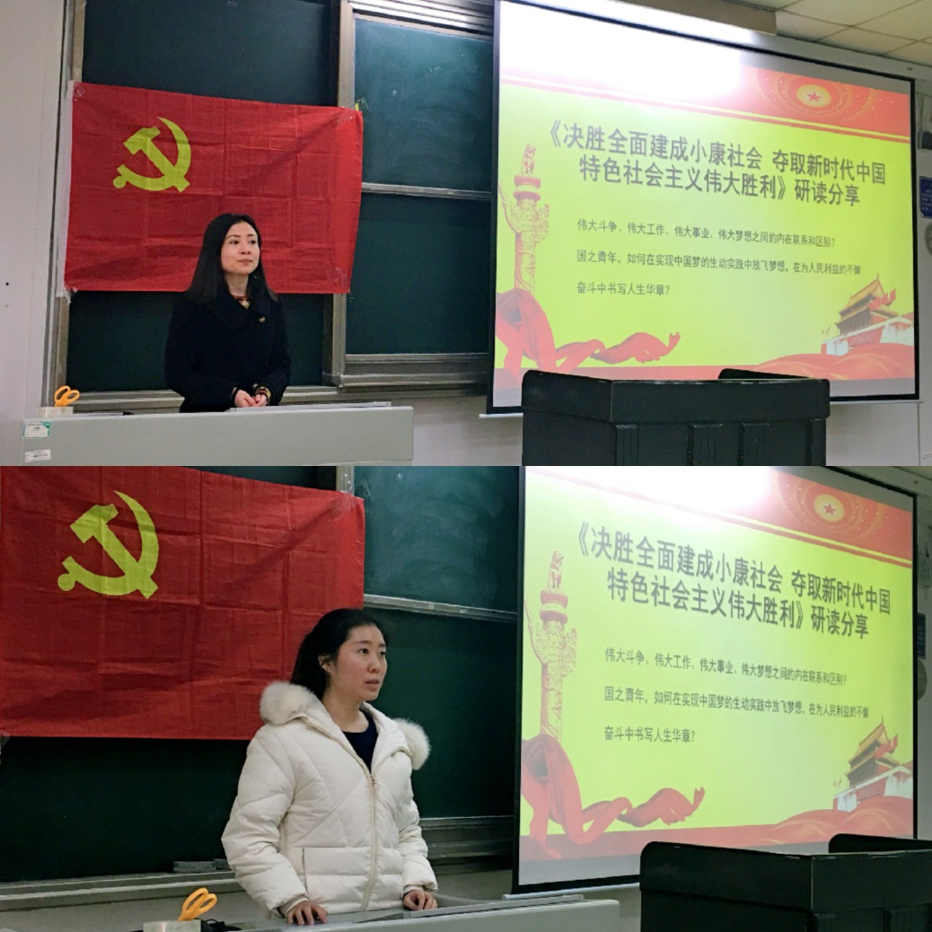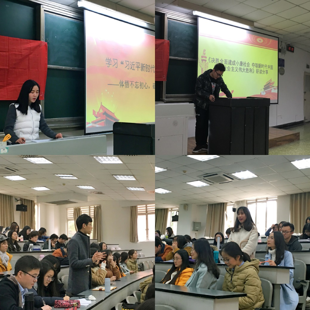 接着,全体党员进入“红色精神”治国安邦——《决胜全面建成小康社会 夺取新时代中国特色社会主义伟大胜利》的学习环节。“红色精神”治国安邦活动依托第一、二支部公共管理类专业党员同志开展,将党建工作与社会治理内容学习相融合。第一支部吴敏同志和第二支部卢雨秋同志分别进行《十九大报告》研读分享。吴敏同志从行政管理专业出发,分享《十九大报告》的框架结构和各个部分的内在逻辑,提出学好专业知识、关注时事政治、扎实政治理论、保持先进性与纯洁性的建议。卢雨秋同志从习近平新时代中国特色社会主义思想、“四个伟大”的理论以及当代青年的理想和担当三个切入点进行了阐述,并提出广大青年在实现中国梦的实践中放飞梦想的建议。