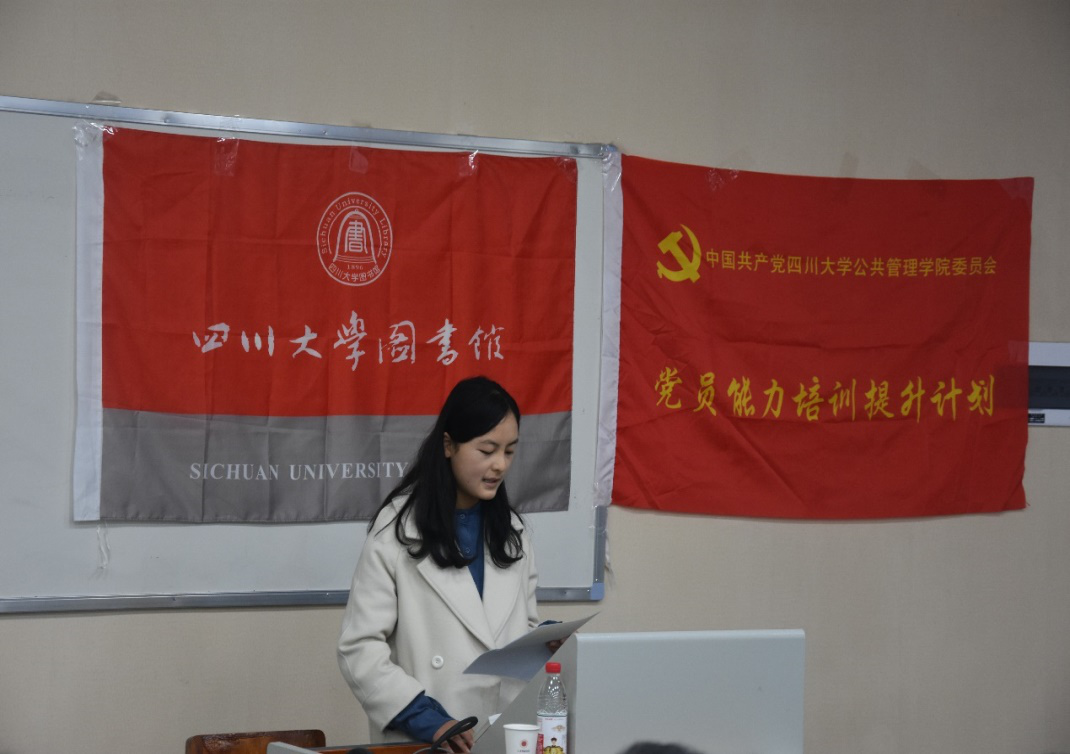 接下来,图书馆教师代表张宸老师和学生代表17级图书情报与档案管理专业的吴晓梅同学围绕“川大校史和红色基因传承”的主题,与大家分享了她们的对我校历史和对红色精神传承的领悟。