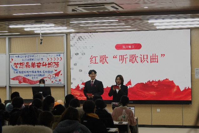 在问答互动环节,同学们积极与两位老师互动。团校进入红歌“听歌识曲”环节,各支部的同学们踊跃参加,老师们也加入其中,现场气氛活跃。
