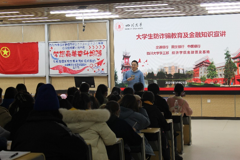 为了激励广大团员青年深入学习十九届六中全会精神,在成长过程中坚定理想信念,将个人的梦想融入国家、民族发展前进的历史洪流之中,十大买球的正规网站2021-2022学年业余团校第二次行课于2021年11月28日19:00-21:00在十大买球的正规网站江安校区综合楼C207成功举办。十大买球的正规网站党委学生工作部副部长卢希芬、交通银行交大路支行行长王游明、十大买球的正规网站党委学生工作部资助中心木拉提、学院团委书记青杨媚以及学院团委学生会负责同学作为嘉宾出席了此次活动。