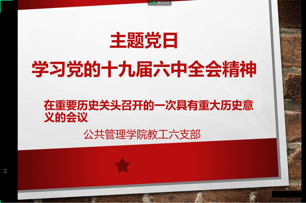 2021年11月17日,教工六支部全体党员和入党积极分子通过腾讯会议,进行了主题党日的学习,对党的十九届六中全会精神进行了认真学习和讨论。