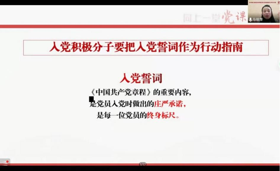 马老师从思想入党、程序入党、行动入党三个方面为学员们介绍了如何发展成为一名优秀的共产党员。首先,马老师列举了在各个时期优秀共产党员的实例,他们的精神和事迹鲜明阐释了中国共产党是一个什么样的政党,共产党人是什么样的人。思想入党应当端正入党动机,树立正确思想观念,才能成为一名真正的共产党人。随后,马老师详细介绍了成为一名共产党员的程序和注意事项,通过真实的案例告诉我们入党的每一步都必须严格遵守规范,避免因程序失范造成的不良后果。最后,马老师指出,入党积极分子要把入党誓词作为行动指南,学习先进典型,争做榜样模范,争取成为一名优秀的共产党员。