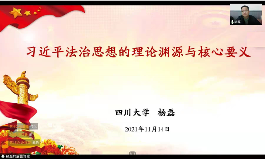 11月14日下午13:30,十大买球官网党委副书记杨磊老师带来了本次提升班的最后一堂讲座“习近平法治思想的理论渊源与核心要义”,讲座由苟欢老师主持。