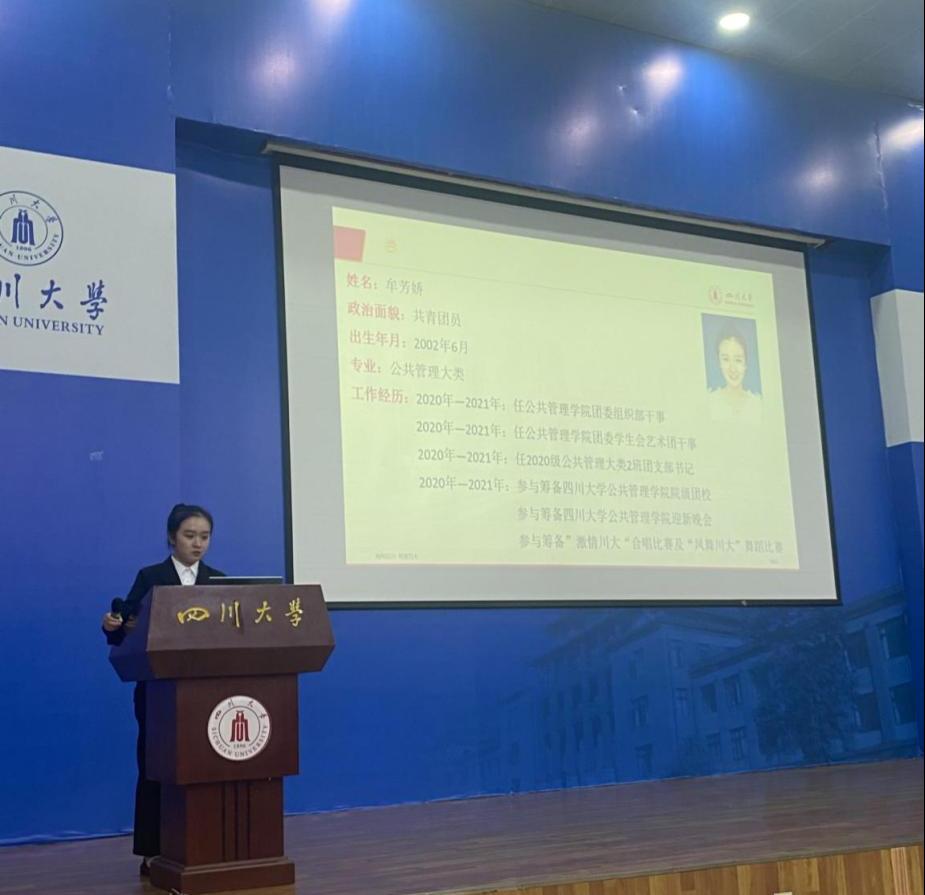 然后进行执行团委学生副书记竞选,候选人牟芳娇从个人在十大买球的正规网站团委学生会一年的实际工作经历出发,概述自己通过一年的历练在工作能力、思想站位上的提升与成长,表达了自我对于学生工作的真诚热爱。