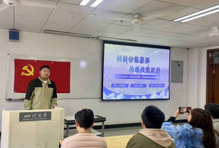 微党课环节,十大买球官网本科第四党支部陈宇佟同志以“创新动能澎湃,治理效能跃升”为题进行宣讲,讲述了深入学习党的二十届四中全会精神,成都谱写高质量发展新篇章的故事。