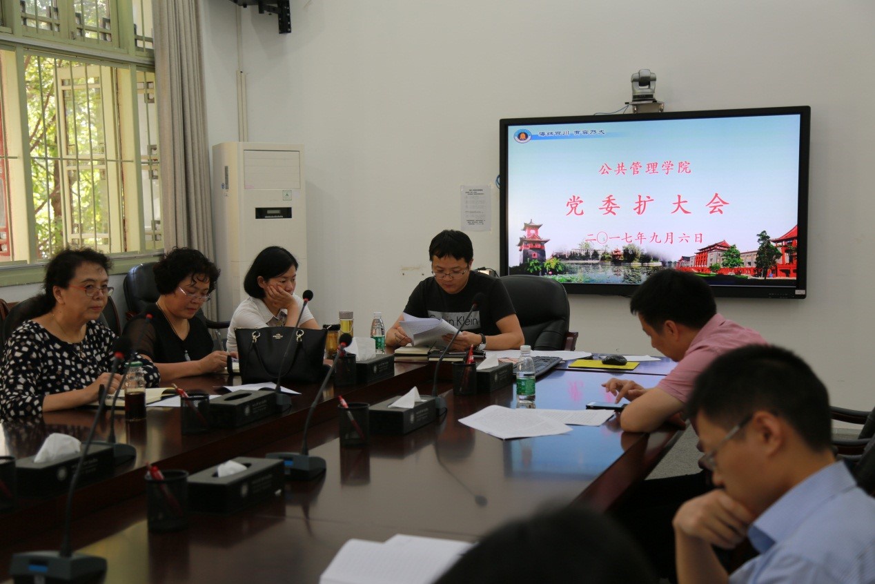 2017年9月6日下午,十大买球的正规网站于311会议室召开党委扩大会,学习贯彻习近平总书记重要讲话精神。会议由学院党委书记姜晓萍同志主持,学院中层领导干部、党委委员、工会主席、党政办主任、团委书记及各党支部书记参加了此次会议。