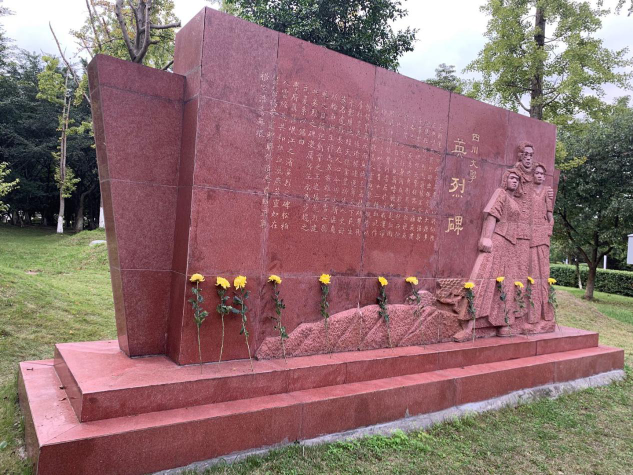 座谈会后,与会师生前往江安校区川大英烈碑,为川大的革命先烈献花。庄严的国歌响起,望着英烈碑上镌刻的文字,学院师生无不感受到川大人浓厚的爱国情怀。全体人员手持鲜花,庄严肃立,向英勇献身的川大革命先驱们默哀致敬。随后,师生依次敬献手中鲜花,瞻仰英烈纪念碑。