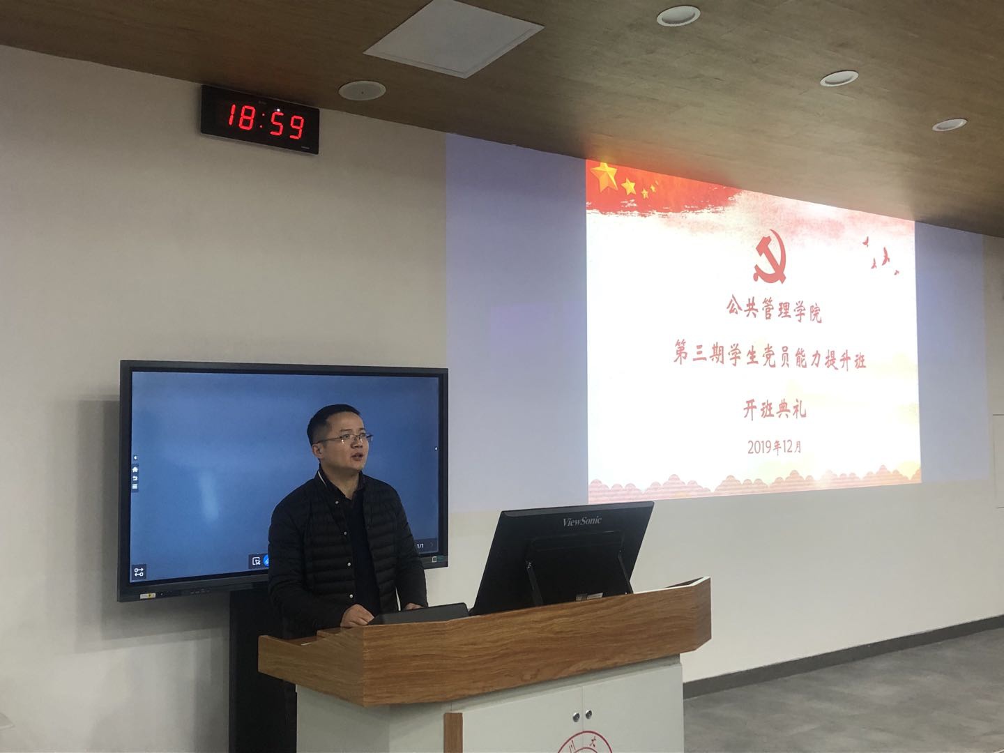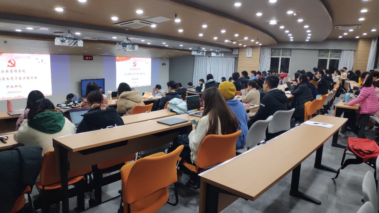 2019年12月13日19时,十大买球官网第三期学生党员能力提升班开班典礼在望江校区基础教学楼C座101教室顺利举行。学院党委副书记兼纪委书记杨磊老师和2017级本科专职辅导员周锐老师、2016级本科专职辅导员兼学生科副科长陈萱源老师以及本次党员能力提升班108位学员出席了典礼,典礼由陈萱源老师主持。