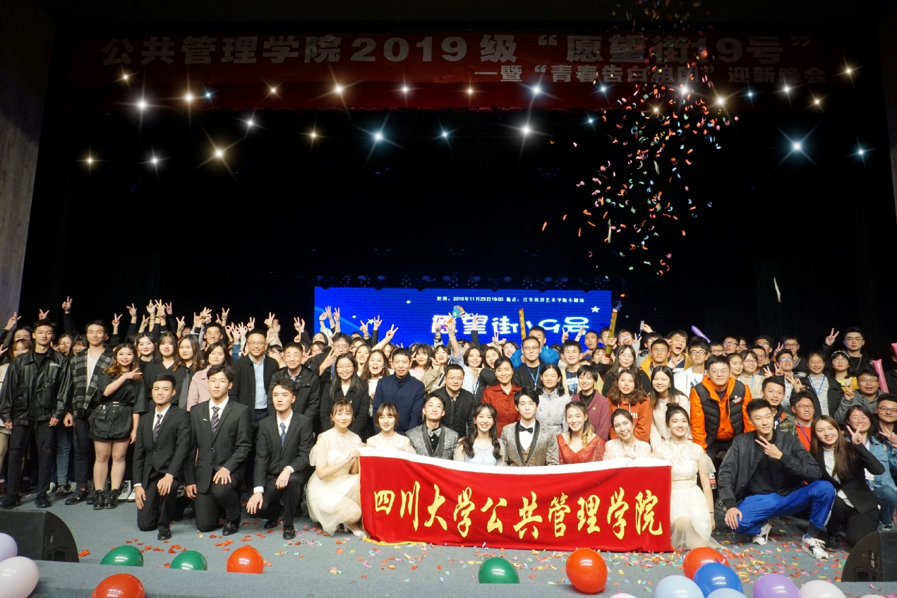 2019年11月23日19:00至21:30,十大买球的正规网站“愿望街19号”迎新晚会于江安校区艺术学院小剧场成功举办。学院党委副书记兼纪委书记杨磊老师、副院长罗亚玲副教授、教导员许吟雪老师、行政管理系主任范逢春教授、劳动与社会保障系主任蒲晓红教授,社会学与应用心理学系马缨教授、党政办主任林茂松老师、团委书记兼2017级研究生辅导员青杨媚老师、学生科科长兼2016级本科辅导员陈萱源老师、2017级本科辅导员周锐老师、2018级本科辅导员刘晓燕老师、2019级本科辅导员刘碧老师等作为嘉宾观看了晚会。