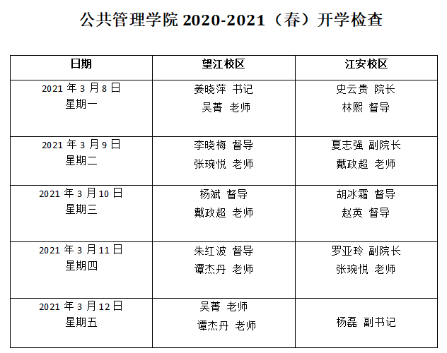 1、学院提前制定开学教学检查一周工作安排表,做到望江、江安两个校区全覆盖,并将开学教学检查责任落实到个人,全院正副职院领导、本科教学督导组成员、本科教务秘书、本科教学管理人员等参与检查。学院党委书记姜晓萍、院长史云贵、副书记杨磊、副院长夏志强、副院长罗亚玲,本科教学督导组胡冰霜、杨斌、赵英、朱红波、李晓梅等老师、本科教务秘书林熙老师以及本科教学管理人员吴菁、戴政超、谭杰丹、张琬悦等对新学期的课程安排与上课情况进行了检查。开学检查分设望江校区和江安校区两个部分,以下是十大买球官网制定并依之执行的开学教学检查安排表: