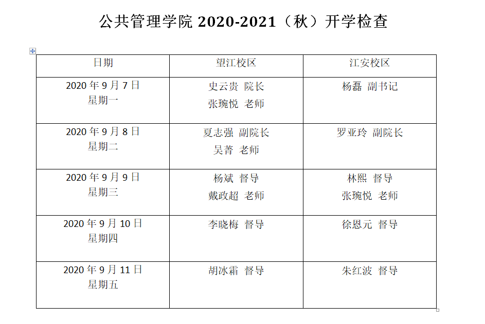 1、学院制定开学教学检查一周工作安排表,做到望江、江安两个校区全覆盖,并将开学教学检查责任落实到个人,全院正副职院领导、本科教学督导组成员、本科教务秘书、本科教学管理人员等参与检查。院长史云贵、副书记杨磊、副院长夏志强、副院长罗亚玲,本科教学督导组胡冰霜、徐恩元、杨斌、朱红波、李晓梅等老师、本科教务秘书林熙老师以及本科教学管理人员吴菁、戴政超、张琬悦等对新学期的课程安排与上课情况进行了检查。开学检查分设望江校区和江安校区两个部分,以下是十大买球官网制定并依之执行的开学教学检查安排表: