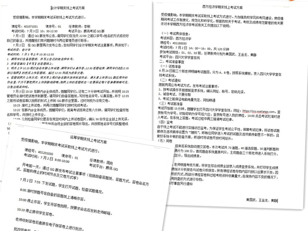 根据四川省教育厅发布的《关于高等学校2020年春季学期开学有关事项的通知》精神,按照我校《关于2020年春季学期学生返校的通知》,结合学院疫情防控工作实际,本学期本科课程期末考试采取了线上考试的方式。