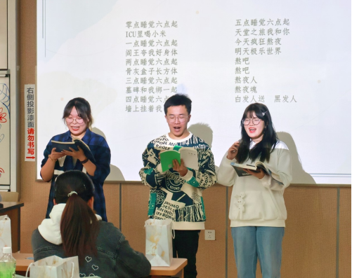 活动进入第一个环节——才艺表演。同学们现场表演了合唱、舞蹈串烧、趣味朗诵、古典舞等精彩节目。《稻香》+《成都》的合唱,让大家感受到青春的活力与相逢于成都的温情;《surfin》+《pop》+《make it right》+《new boy》舞蹈串烧,让大家在各式各样风格的舞蹈中感受到同学的蓬勃朝气与激情;《反向带货》、《套马杆》等4个趣味朗诵作品,引发现场欢笑不断;古典舞《竹林深处》,让在场的老师与同学沉醉其中;最后,《灯花》合唱,现场的老师同学都陶醉于其悠扬歌声之中。