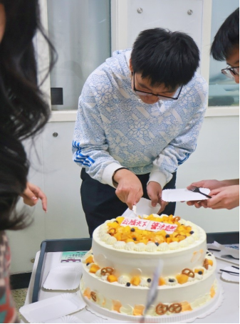 第二个环节——切蛋糕。班委将两个分别写有“公成天下,管法自然”和“行以明德,管以兴邦”的蛋糕推入活动现场,范逢春和李晓梅两位老师上台同切蛋糕,由班委成员分发,点燃欢乐的氛围。