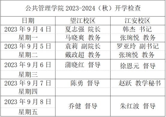 学院提前制定开学教学检查一周工作安排表,做到望江、江安两个校区全覆盖,并将开学教学检查责任落实到个人,全院正副职院领导、本科教学督导组成员、本科教务秘书、本科教学管理人员均参与检查。学院党委书记韩杰、院长夏志强、副书记罗亚玲,副院长袁莉,教学督导组、本科教务秘书以及本科教学管理人员等对新学期的课程安排与上课情况进行了检查。开学检查分设望江校区和江安校区两个部分,以下是十大买球官网制定并依之执行的开学教学检查安排表: